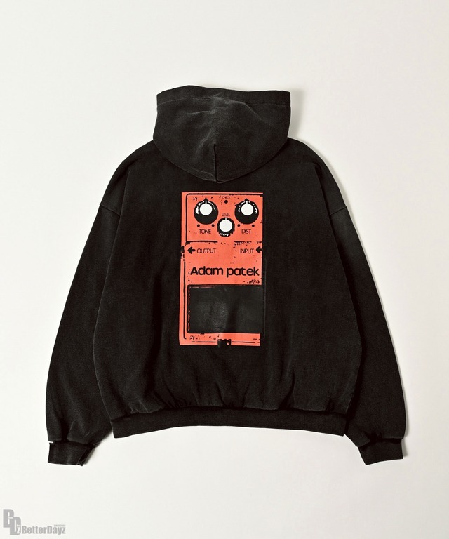 COL : black size : 2 身幅 : 68cm / 着丈 : 70cm / 袖丈 : 58cm 肩幅 : 64cm MATERIAL : 本体 :綿100% リブ:綿95% / ポリウレタン5% 画像と実物ではカラーが若干異なって見える場合もございます。 多少のサイズ誤差は何卒ご了承くださいませ。 セール品・実店舗と在庫を共有している一部商品は、 店頭での陳列、試着により 若干の色あせや履きシワが生じている可能性がございます。 予めご理解くださいますようお願い申し上げます。 『distortion of the explosion : 爆音の歪み』 空気の流れで繊維を撚る技術によって作られた、 OE糸の裏毛素材を使用したプルオーバーパーカー。 「オープンエンド糸(Open-End Yarn)」 空気を使いながら繊維を撚り合わせる 「空紡」という方法で作られます。 これにより、繊維の間に空間ができ、 生地にドライでざっくりした風合い、 適度な硬さ、ガサ感が生まれます。 肉厚で繊維間に空間があるため、 ボリューム感があり、 ざっくりとした着心地です。 アナログなエフェクターをモチーフにした グラフィックで、 ヴィンテージ感にこだわりました。 身幅とアームにゆとりを持たせ、 着丈を抑えた設計が、 現代的なシルエットに。 ~ ADAM PATEK / アダムパテック ~ 2014年より始動。 tokyo design teamが発信するユニセックスブランド。 素材や質に拘り、 ベーシックで馴染みやすいデザインが特徴。