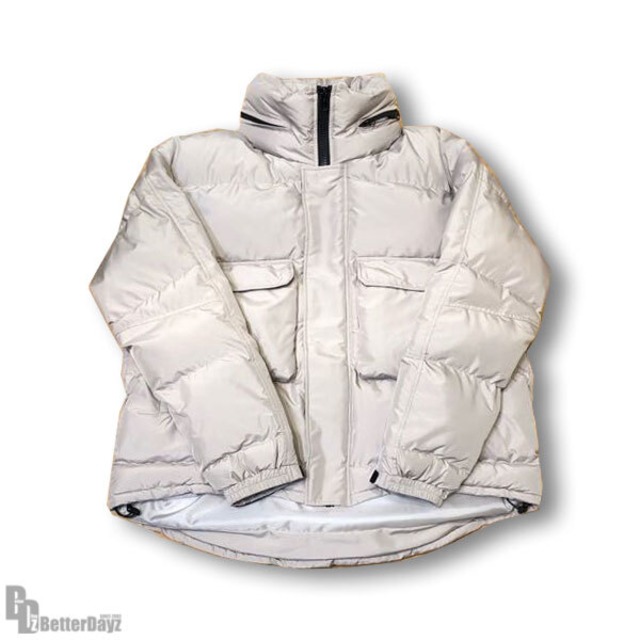 COL : GRAGE サイズ : M 着丈 : 72cm / 身幅 : 66cm / 肩幅 : 59cm 袖丈 : 58cm MATERIAL : 表地:ポリエステル100% 裏地:ポリエステル100% 中綿:ポリエステル100% 画像と実物ではカラーが若干異なって見える場合もございます。 多少のサイズ誤差は何卒ご了承くださいませ。 セール品・実店舗と在庫を共有している一部商品は、 店頭での陳列、試着により 若干の色あせや履きシワが生じている可能性がございます。 予めご理解くださいますようお願い申し上げます。 大胆なサイジングとシルエットが ストリートライクな雰囲気を演出する1着です。 袖幅は大きめのボリュームスリーブで、 袖口がゴム仕様で雰囲気あるボリューム感に。 高めに設定されたスタンド襟が 首回りを暖かく包み込んでくれます。 ゆったりとしたシルエットのため、 ユニセックスでもおすすめです。 上品で光沢感が美しく軽く柔らかな風合いの ポリエステル素材を採用。 保温性を考慮し、 軽量な中綿入りで防寒アウターとしても重宝します。 デイリーコーデを豊かにすること間違いなしの ボリュームアウターです。