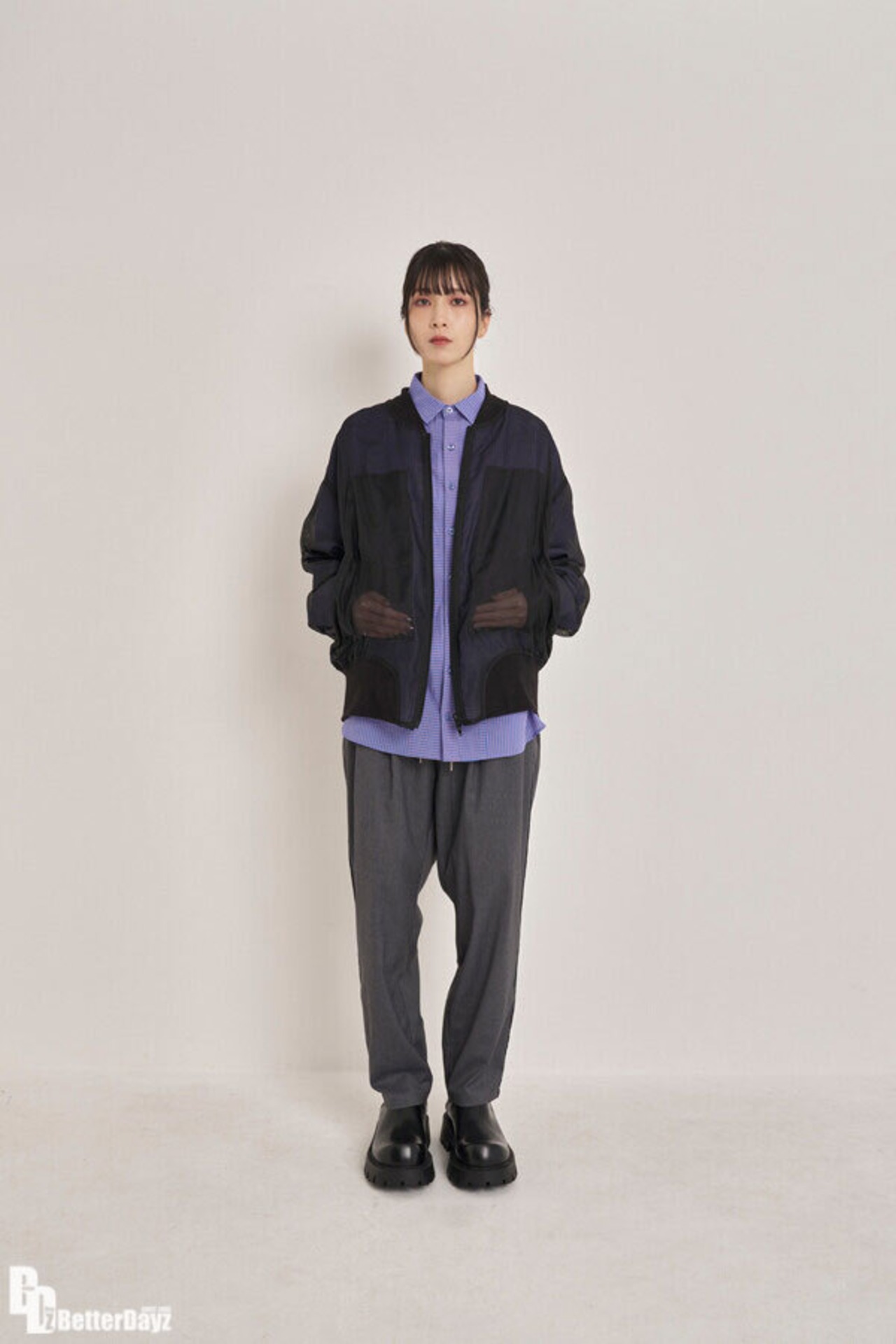 袖やポケット部分の異素材切り替えがアクセントになり、