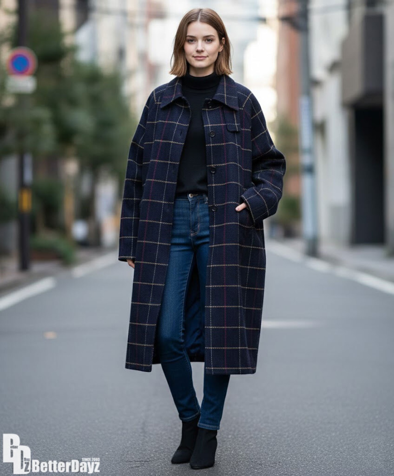 厚手のニットの上から羽織っても着膨れせず、大人の余裕を感じさせる佇まいに