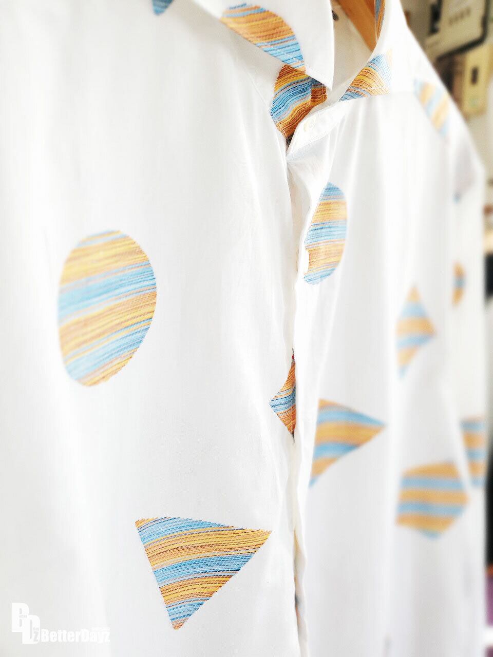 マルチカラージャガードが特徴的な洒落感溢れる生地を使用したシャツ。