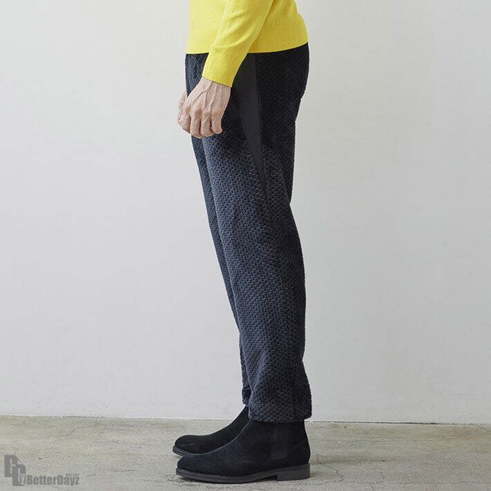 ウエストやポケット口が随所に布帛に切り替えられ、